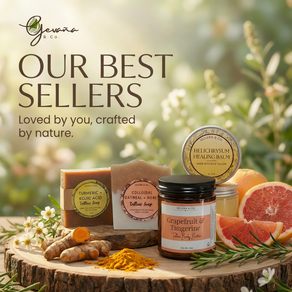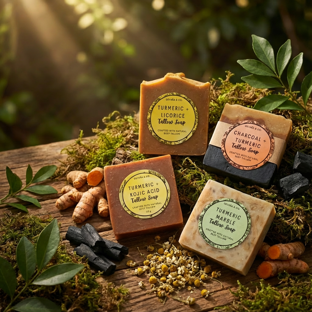 Made with nourishing tallow to support the skin barrier, this turmeric-based collection helps cleanse without dryness while improving the look of uneven tone and dullness. Kojic and licorice are included to support a brighter, clearer-looking complexion, making these soaps ideal for daily use by those seeking smoother, more radiant skin.